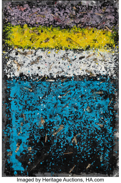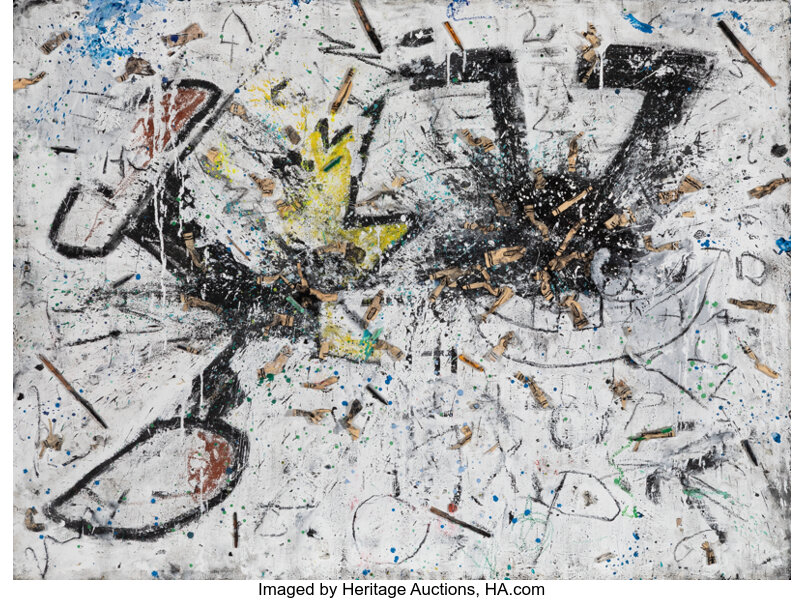 Acrylic, melted wax crayon, paper, soot, and wooden matches on canvas mounted on wooden panel