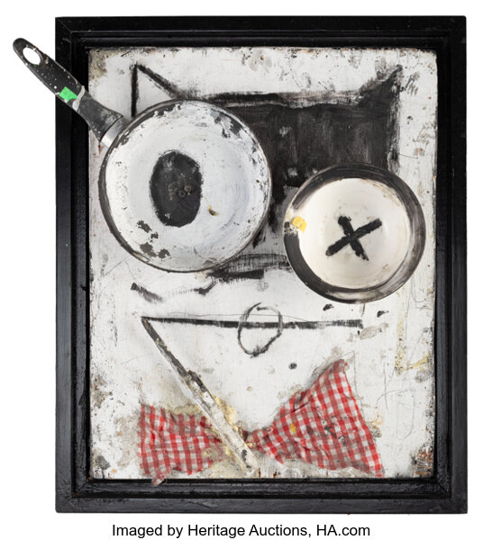 Acrylic, melted wax crayon, soot, found objects on wooden panel