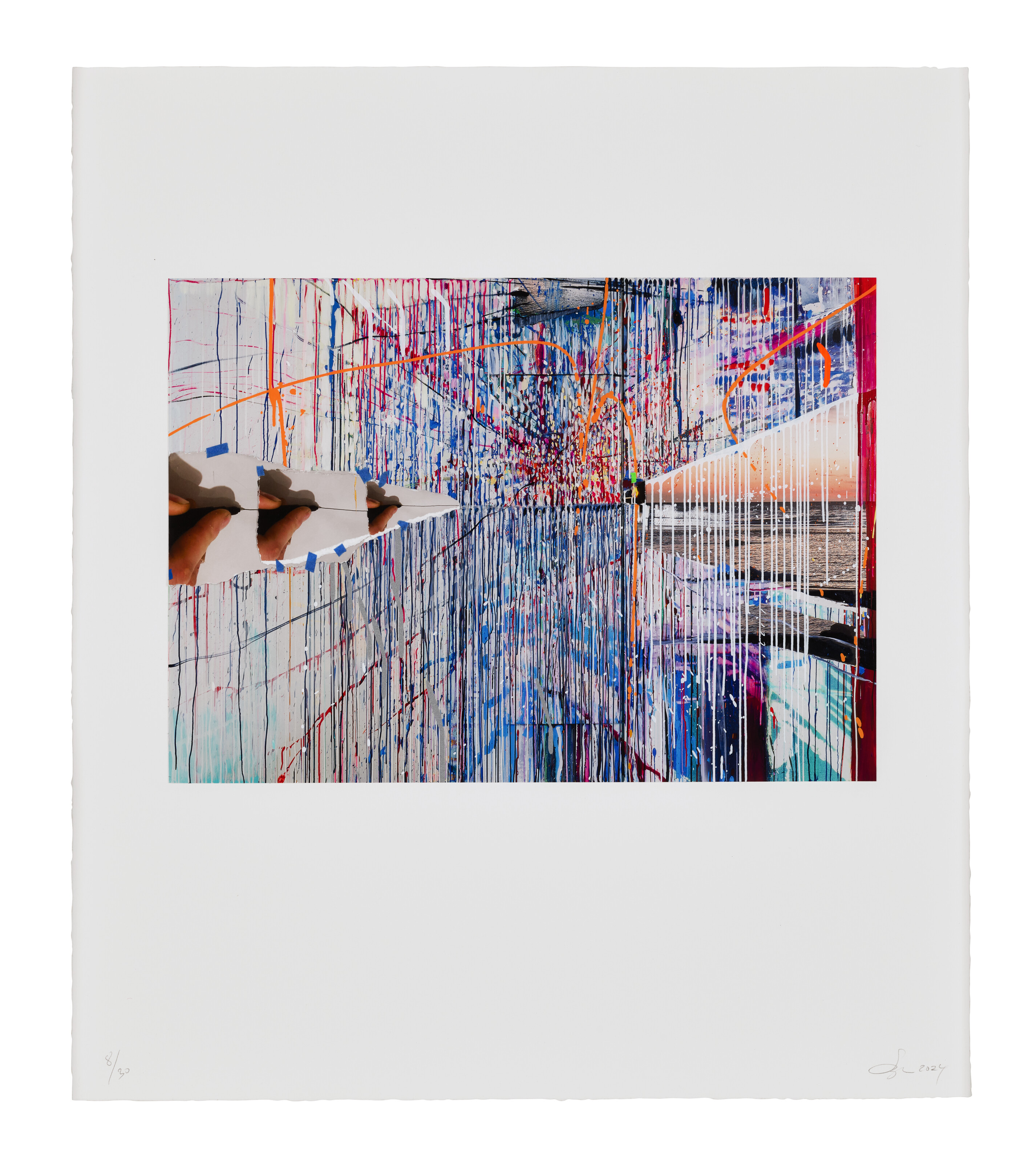 archival inkjet print and screenprint in colors with collage, tape and blind embossing, on Rives BFK paper