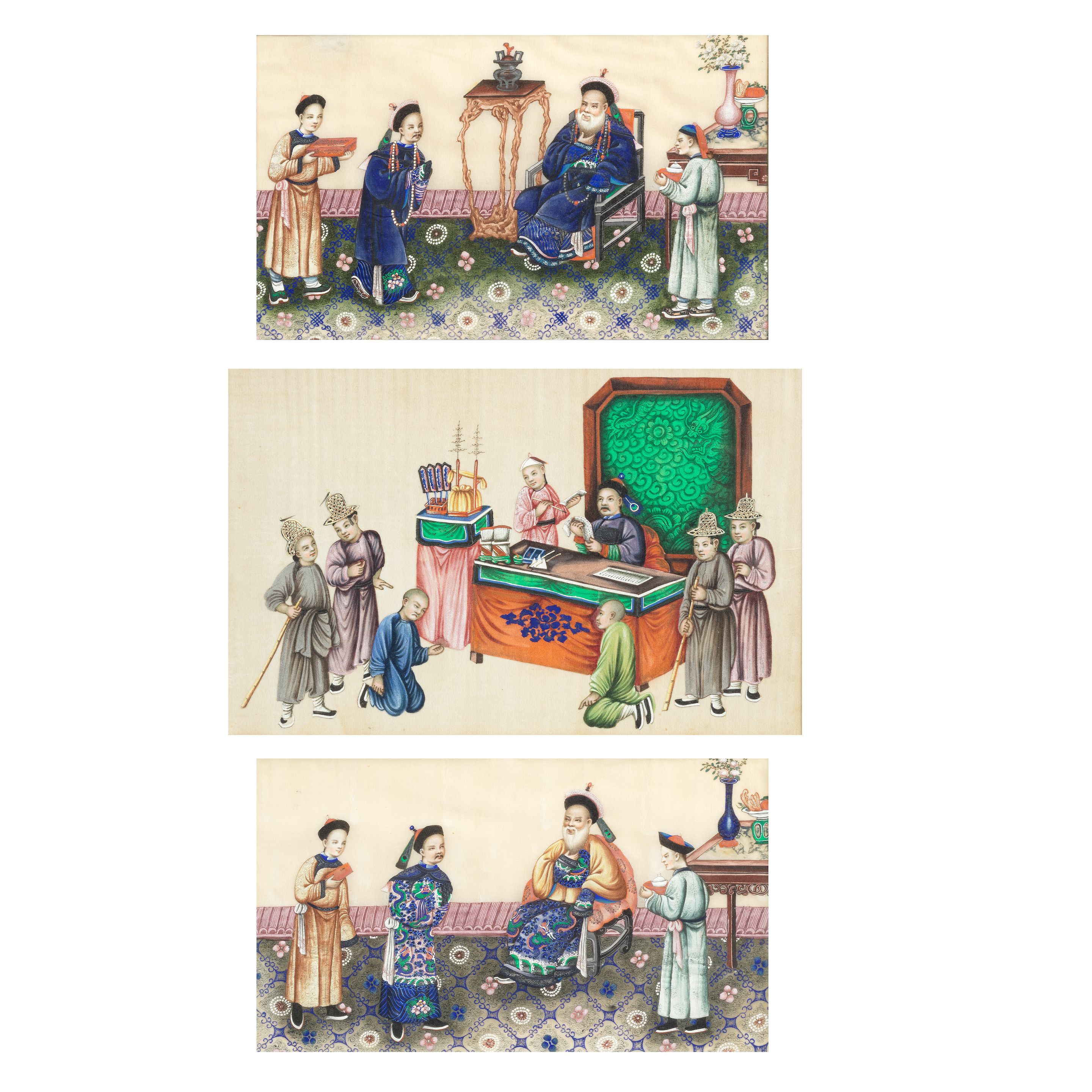A Chinese export reverse painted figural landscape mirror panel mounted within a japanned ...