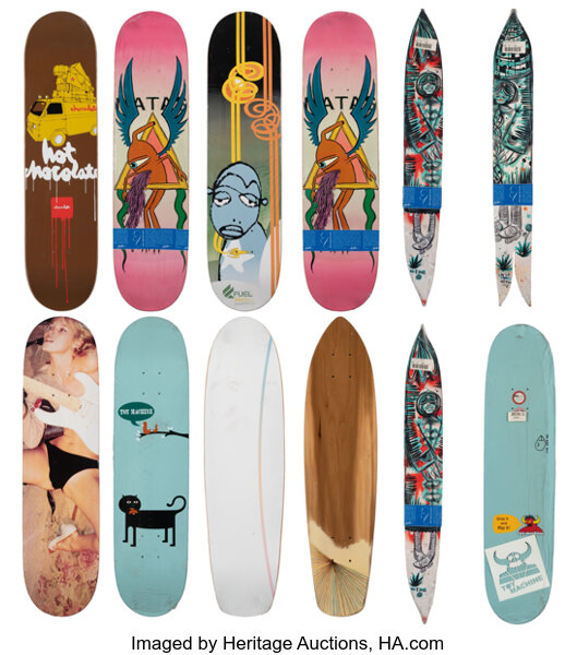 Various Artists Camo; Krylon; Ravager (three works), 2016-2019 Offset lithographs in colors on skate decks 31 x 8 inches (78.7 x 20.3 cm) (each) Ed. 59/300; 9/50 The group comprising: 1 KidRobot camo skate deck, edition 59/300; 1 Denial Krylon skate deck, edition 9/50; 1 Quiccs Ravager skate deck. 3 Total HID12401132022 © 2026 Heritage Auctions | All Rights Reserved www.HA.com/TexasAuctioneerLicenseNotice
