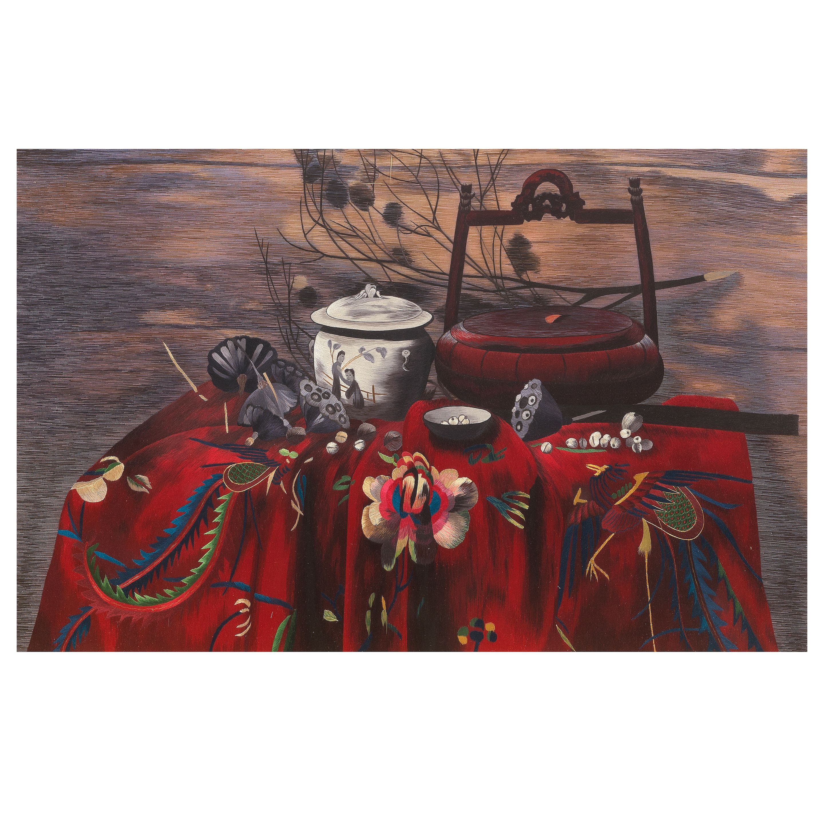 A Chinese silk work panel depicting a still life in the Suzhou style