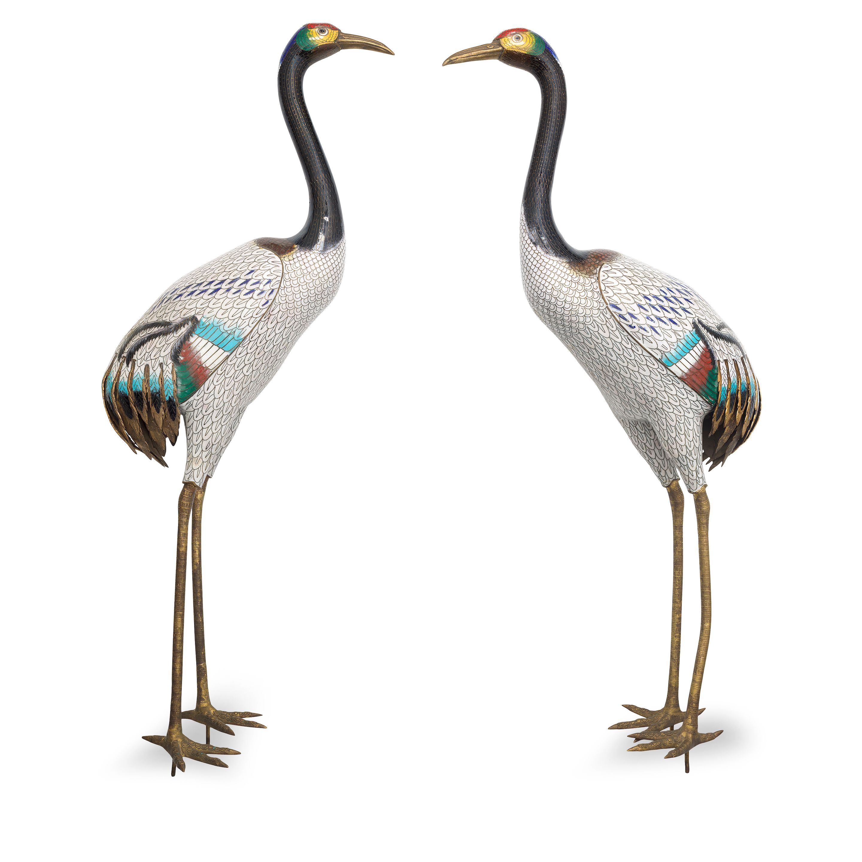 A pair of Chinese cloisonné models of standing cranes