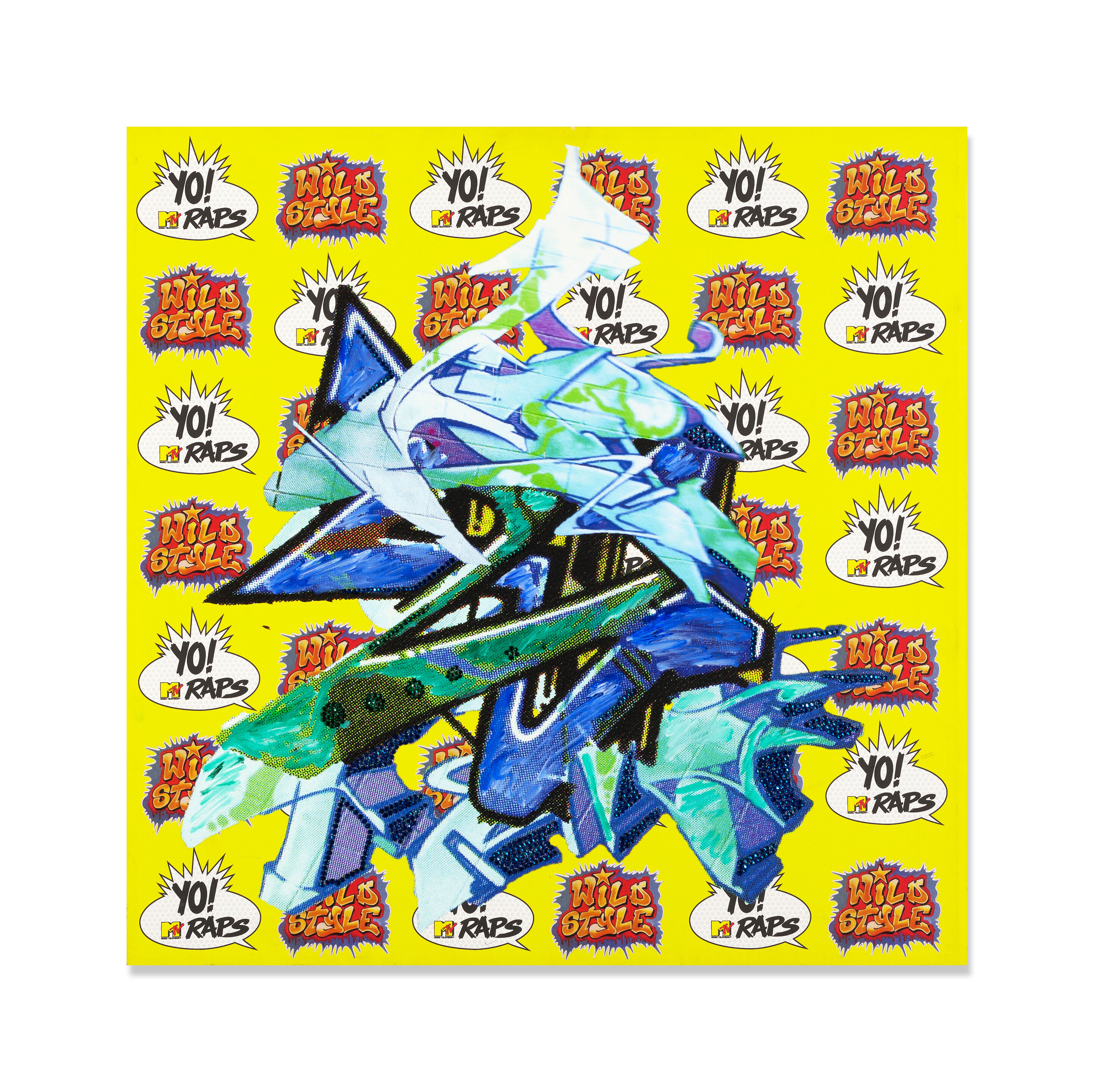 acrylic, screenprint, and crystals on canvas